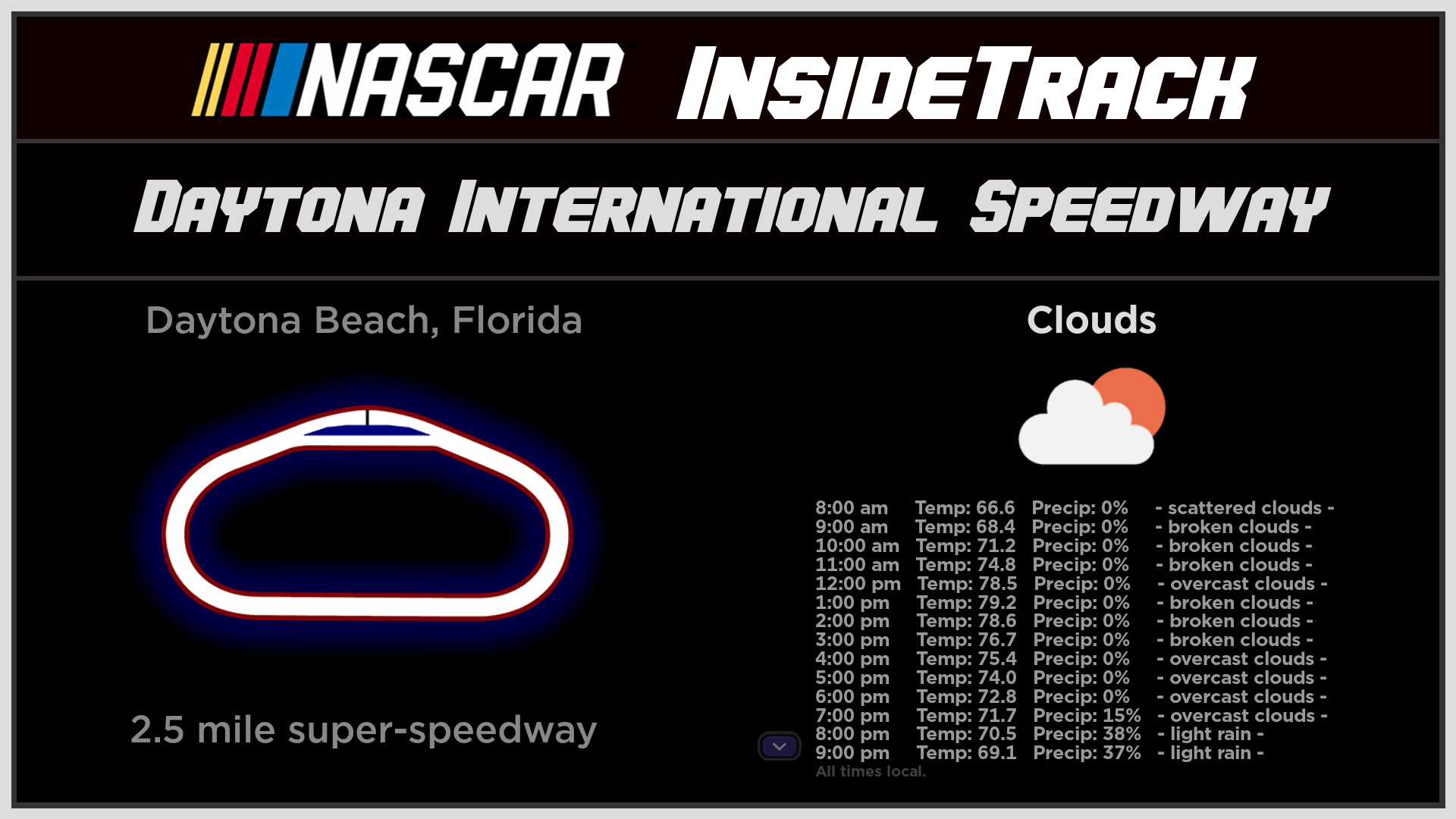NASCAR InsideTrack, only on Roku, is now available! Get updated weekly schedule information, completed race results, video highlights, track information, up-to-date standings, TV times (for YOUR time zone!), current conditions, 12 hour track forecasts, and more! There's no better way to keep up-to-date and showcase NASCAR on your big-screen!