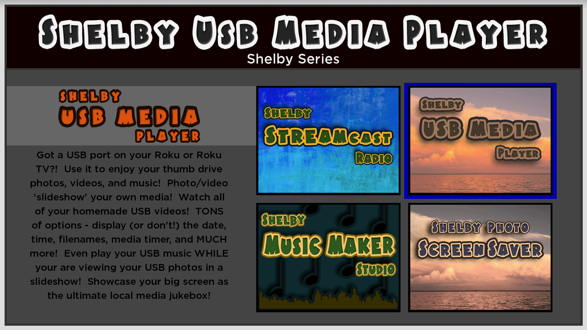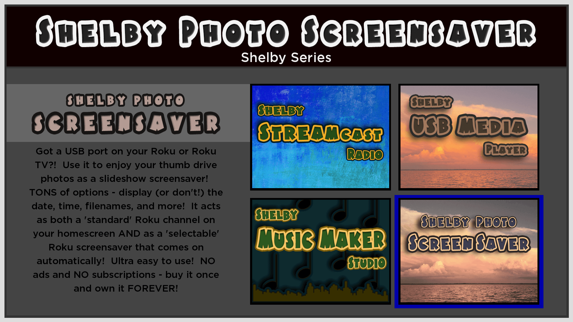 Use your USB photos as your Roku's screensaver! Both a 'channel' AND a 'screensaver' - search for Shelby Photo ScreenSaver from your Roku today!
