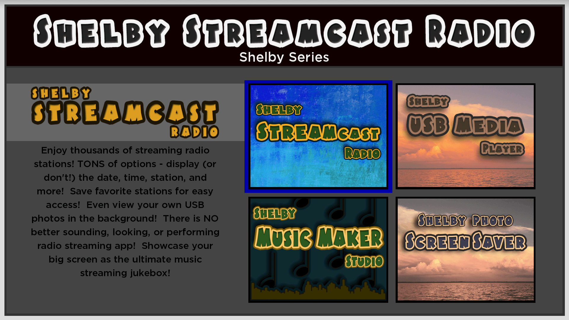 Top 100, oldies, classical, symphony, blues, rock, rap, metal, reggae, hip-hop, R&B, piano, country, pop, techno, news, global top hits, Christmas/holiday, instrumentals, ambient, video game music, movie soundtracks, and more! Slideshow your USB photos while listening! Make your Roku the ULTIMATE streaming jukebox - search for Shelby Streamcast Radio from your Roku today!